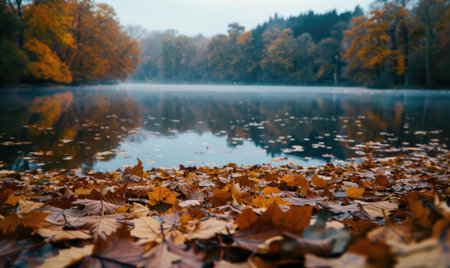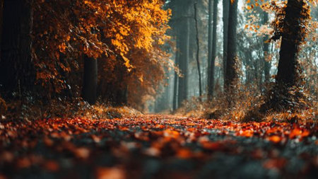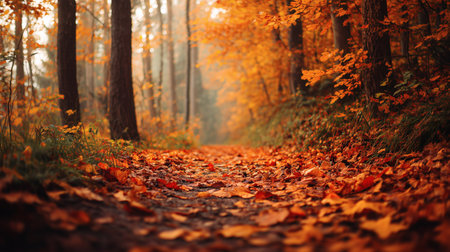 Tranquil forest path lined with fallen autumn leaves and soft misty atmosphere