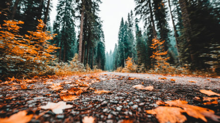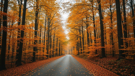 A serene autumn road enveloped by colorful foliage, offering a peaceful escape into nature. Ideal for capturing the essence of fall tranquility.