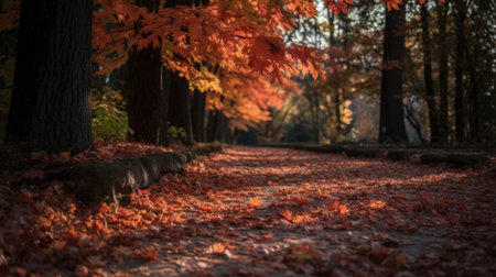 A pathway winds through a forest under a canopy of autumn foliage. Fallen leaves blanket the ground, illuminated by natural sunlight. A wooden fence borders the path. This serene landscape can be used for various commercial applications, including editorial projects and visual storytelling.