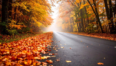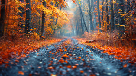 Misty autumn road lined with vibrant orange and yellow leaves, disappearing into a foggy forest