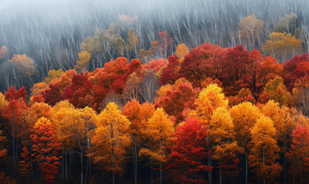 Autumn leaves changing colors in a serene forest during a bright afternoon