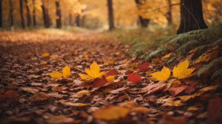 A beautiful shot of fallen maple leaves on the ground with a blurred background of trees. The warm colors of the leaves create a stunning visual effect, capturing the essence of autumn in nature.
