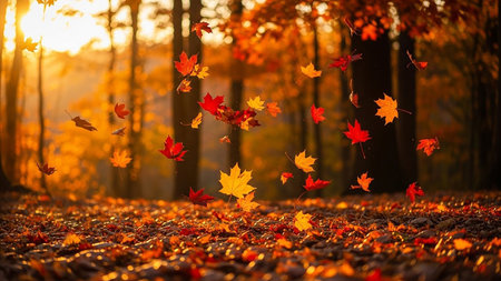 Golden and red leaves spiral down from trees, landing softly on the forest floor as the sun sets, casting a warm glow through the branches.