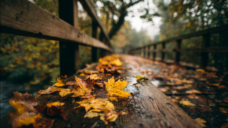 A captivating autumn scene featuring a wooden bridge adorned with golden leaves. The mist surrounds the serene atmosphere, inviting tranquility and exploration.