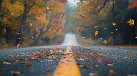 An autumn road lined with trees shedding leaves, with colorful foliage falling onto the pavement