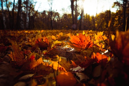 Maple leaves on the ground in autumn. Fall season concept.