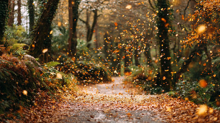 Autumn or fall season. The Rustling Foliage Symphony. A serene forest path lined with golden-hued leaves, their gentle rustling creating a symphony of autumn sounds.