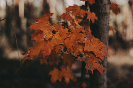 Vibrant orange autumn leaves on trees, creating a warm and cozy atmosphere