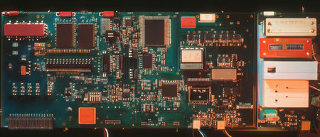 This image presents a detailed view of a computer circuit board. It showcases a complex arrangement of electronic components, including chips, capacitors, and connectors. The composition features a macro perspective, highlighting intricate details and textures. The lighting emphasizes the arrangement of the elements, suitable for various technological and industrial applications.