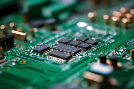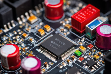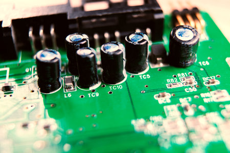 Macro image showcasing the intricate design of a motherboard with electronic capacitors and microchips in sharp focus.