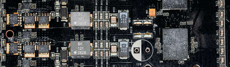Close up view of black pcb with gold connectors, technology concept horizontal banner design