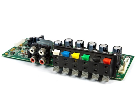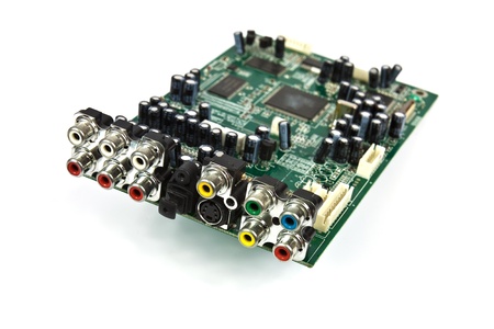 Old printed circuit board with resistors and capacitors from an analog TV close-up