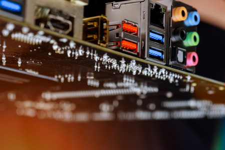 connectors USB on computer motherboard background, board socket and input and output ports close-up
