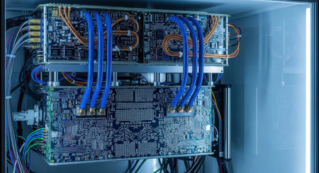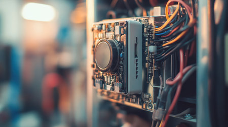 This image showcases a complex circuit board filled with colorful wires and connectors, highlighting the intricacies of electronic engineering and design.