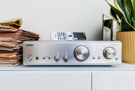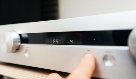 Paris, France - Jun 3, 2024: Male hand pressing the aluminum button on the facade of the Onkyo P-3000R preamplifier to restore the input sampling frequency by converting it to x2, emphasizing high-quality audio processing and premium design