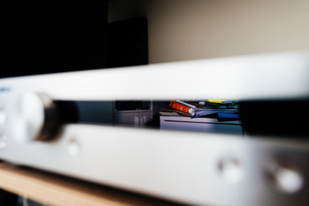 Multiple books and a table with various items reflected in the preamplifier display in an audiophile room, capturing a blend of high-end audio equipment and a personal, cozy environment.