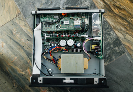 Munich, Germany - Sep 11, 2023: Directly above view of open metallic lid of the Onkyo R-N855 Network Stereo Receiver for repair