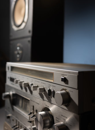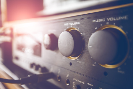 Amplifier button control of audio system for music background style in dark tone and soft focus.