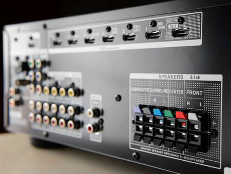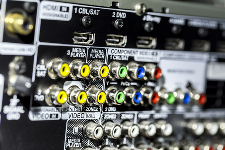 Detailed shot of input plugs at the back of a home theater receiver