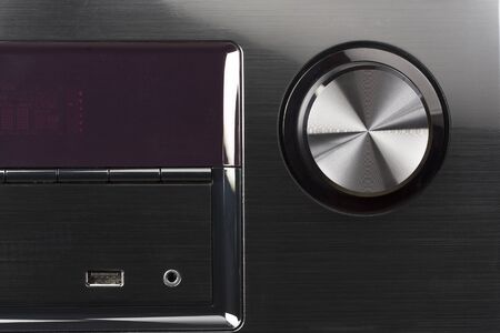 Metal volume control knob on a foreground of the home stereo mini music system close-up at selective focus