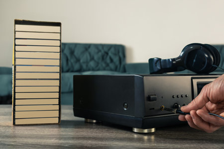 Male hand connecting headphones jack to old audio tape recorder. Hand switches on cassette deck, igniting nostalgia in music archive