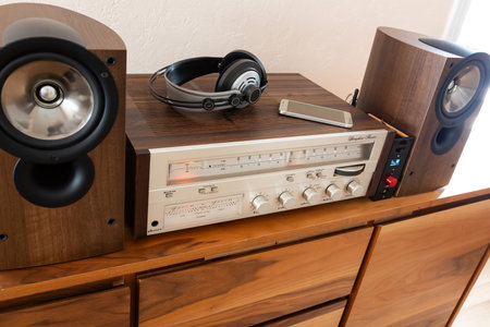 Home Vintage Stereo Receiver with Loudspeakers and Headphones Placed on Wooden Retro Shelf. Smartphone as a Source, New and Old Technology Working Together.