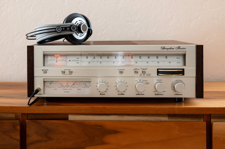 Home Vintage Stereo Receiver with Headphones Placed on Wooden Retro Shelf.