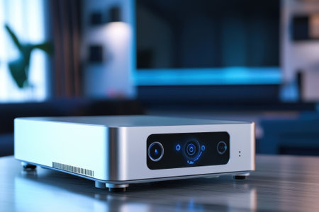 A sleek multimedia projector rests on a wooden table in a contemporary living room filled with light.