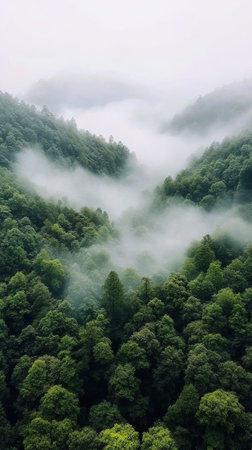 Dense trees create a rich green canopy in a mountainous area, with mist swirling between the treetops at dawn. The tranquil atmosphere invites exploration and reflection amidst nature.