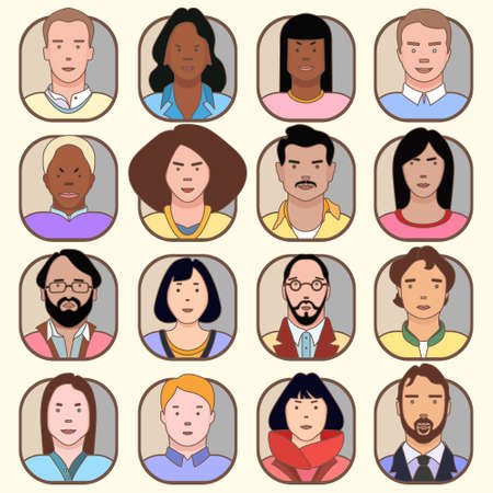 Set of various people avatars vector illustration. Multiethnic user portraits. Different human face icons. Male and female characters. Smiling men and women.