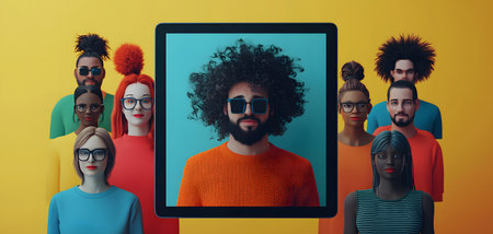 A colorful grouping of virtual figures highlights teamwork in a remote setting. They showcase diverse hairstyles and outfits, with a prominent figure in a digital frame at the center.