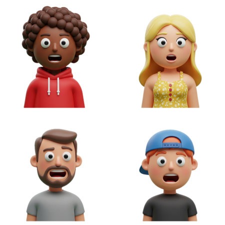 A group of animated characters expressing surprise.