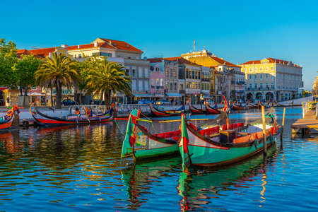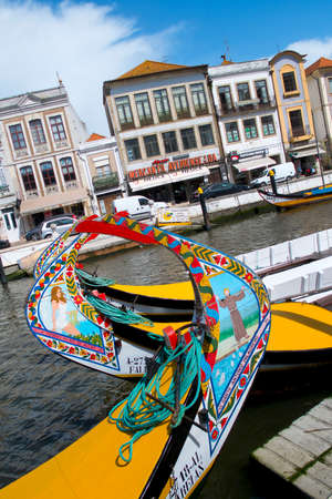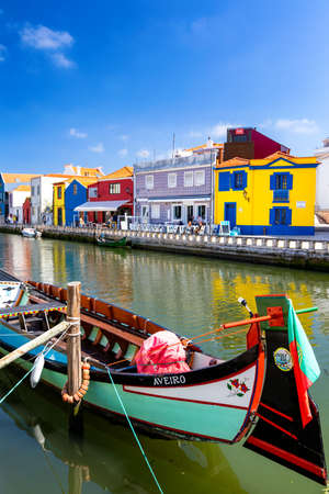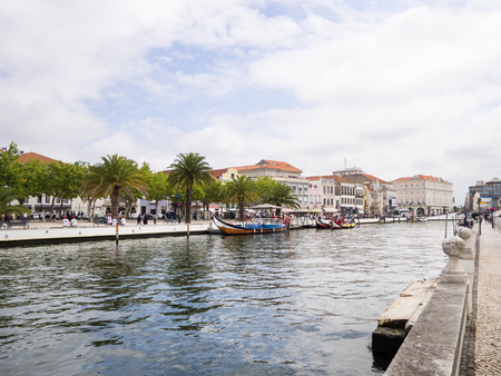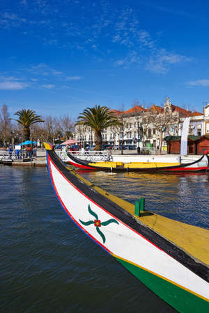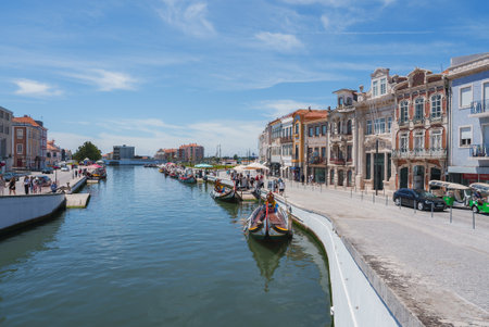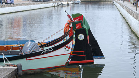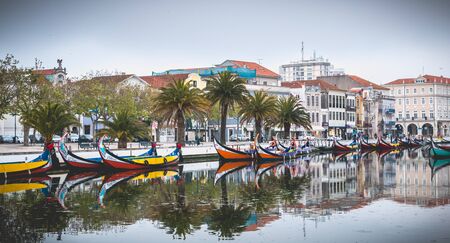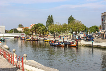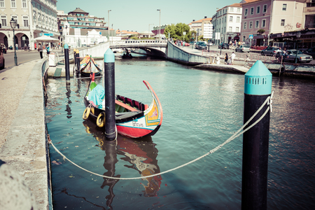 AVEIRO, PORTUGAL - JUN 30, 2017: Traditional boats moliceiro on main city canal. City is called the Portuguese Venice because local boats on the Vouga River have a characteristic shape and colouring.