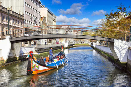 AVEIRO, PORTUGAL - OCTOBER 14, 2017: Traditional colorful Moliceiro boat on a canal in Aveiro, Portugal
