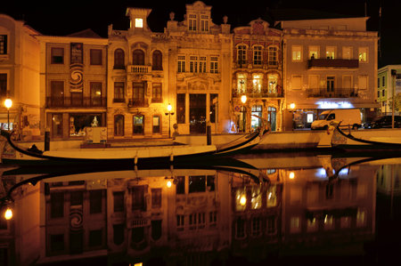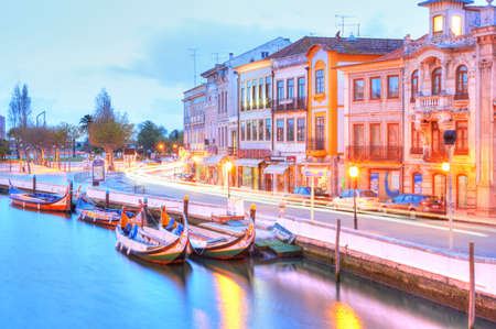 Night photos of the main city canal in Aveiro with traditional boats, Portugal