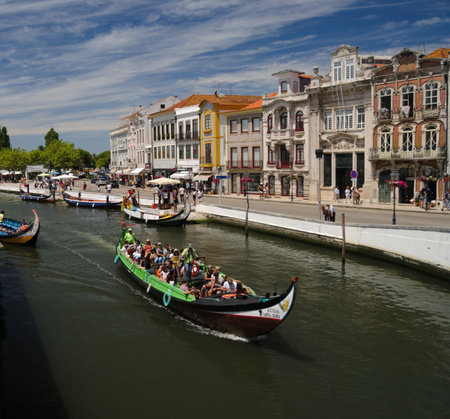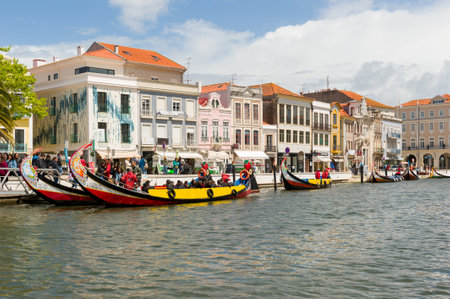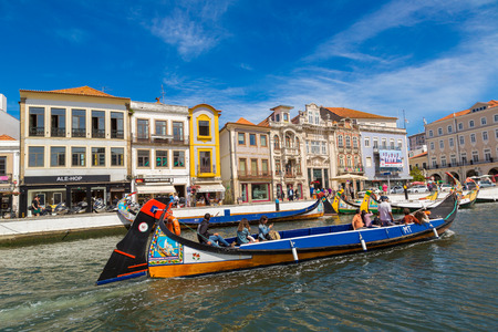 Tourist ride with boats in Aveiro, traditional boats that travel through the canals on a sunny day,