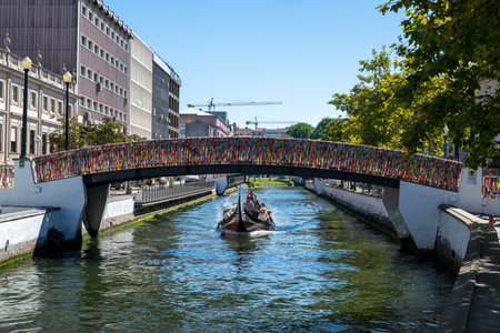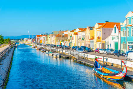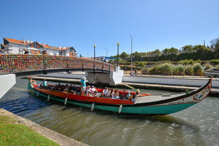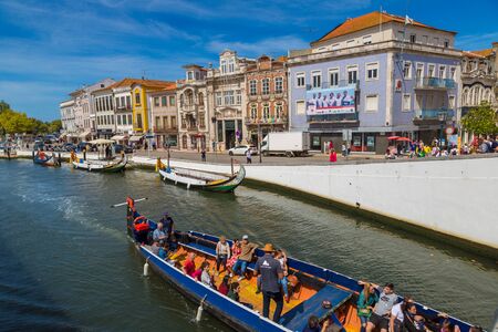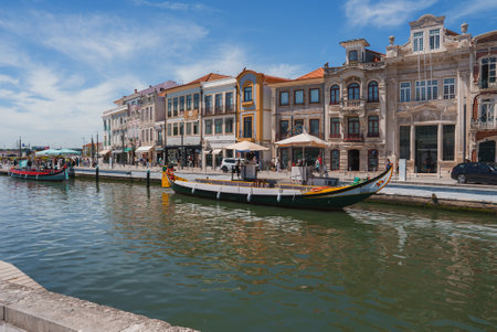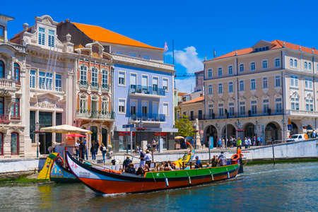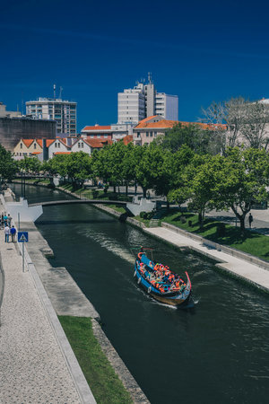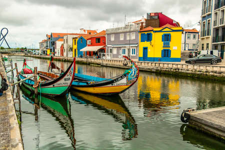 AVEIRO, PORTUGAL - AUGUST 3, 2020: Aveiro canal gondola-style boats in Portugal. Aveiro is known as the Venice of Portugal because of its canals.