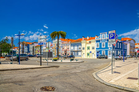 Aveiro, Portugal, June 13, 2017: round square in Aveiro city historical center with typical traditional colorful multicolored buildings houses, blue sky in sunny summer day background