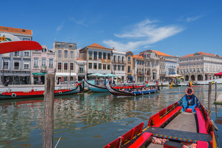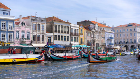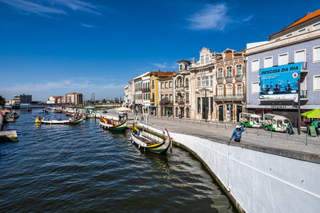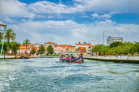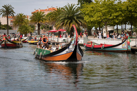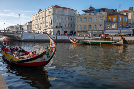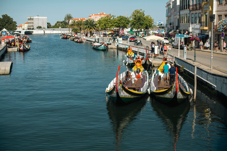 AVEIRO, PORTUGAL - JUL 7, 2022: Traditional boats gondolas moliceiros on the Vouga River. Through the city passes through a network of canals, so the city is sometimes called the Venice of Portugal.