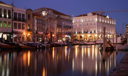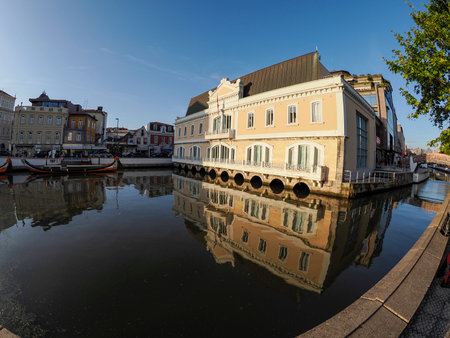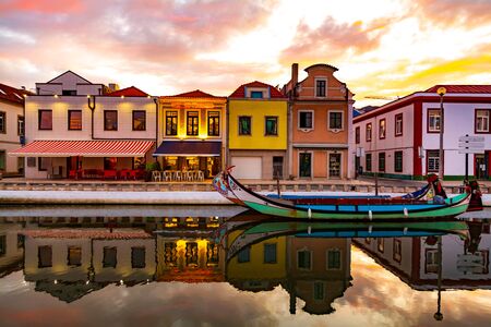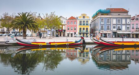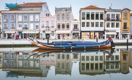 Aveiro, Portugal - April 2019: Central water canal view to Art Nouveau buildings, moliceiros and beautiful reflections