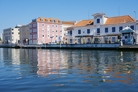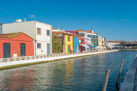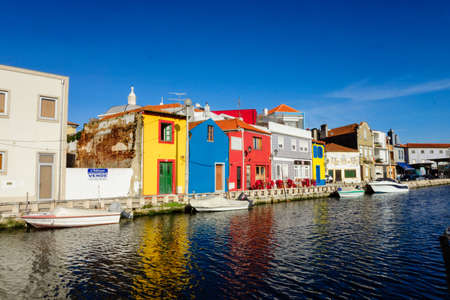 Colorful buildings in european Aveiro city in Portugal, clear blue sky in 2022 warm sunny spring day on May.