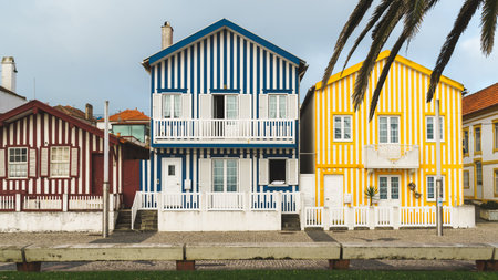 Aveiro / Portugal - 10/01/2019: Costa Nova beach famous wooden houses painted with lines in different bright colors.