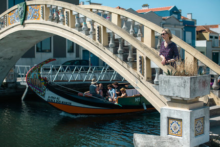 Aveiro, Portugal - May 7, 2018: Tourists walk on famous Moliceiros on a spring evening, traditional boats used to harvest seaweeds in the past