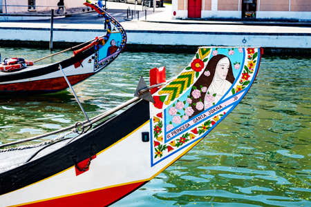 AVEIRO, PORTUGAL- APRIL,03,13: Colorfully painted prow of decorated seaweed collecting boat docked in Central Canal, Aveiro, Portugal on April 3, 2013