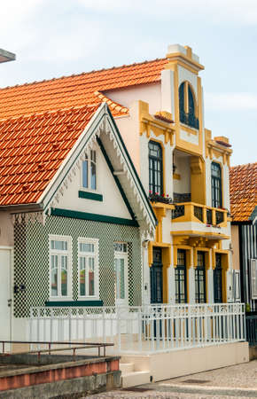 Typical houses of different architectural colorful styles with red roof tiles at famous Beach Costa Nova street in Aveiro, Portugal