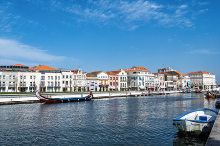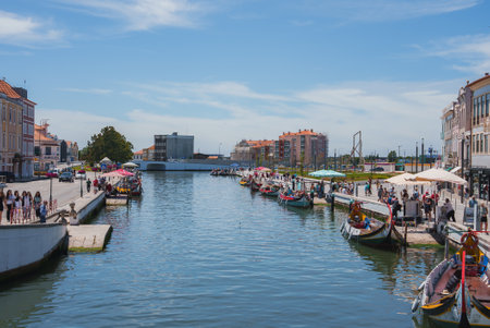 Aveiro River on a sunny afternoon on a summer day.Traditional boats on the canal in Aveiro, Portugal.