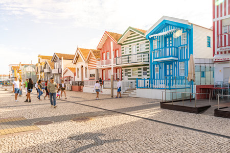Street with typical striped fishing houses Costa Nova, Aveiro, Portugal. COSTA NOVA, PORTUGAL - August 19, 2019
