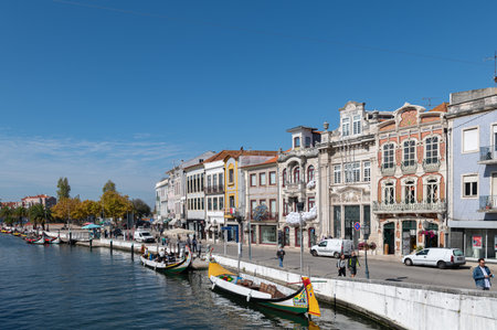 Aveiro, Portugal - Mar 18, 2025: Traditional boats on the canal in Aveiro, Portugal. Colorful Moliceiro boat rides in Aveiro are popular with tourists to enjoy views of the charming canals.