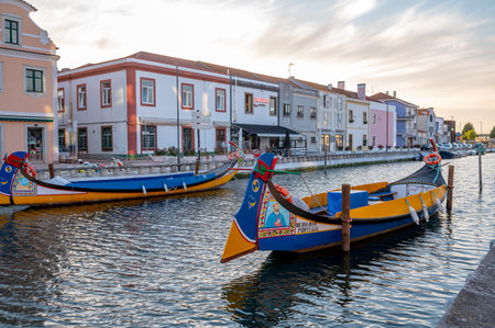 Aveiro, Portugal - April 2019: Tradicional Moliceiro boats docked in the main canal near Rossio after sunset.