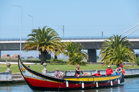 AVEIRO, PORTUGAL - JUL 7, 2022: Traditional boats, type of gondolas, barcos moliceiros once used for collecting molico seaweed but are currently a popular tourist attraction on Ria de Aveiro canals.